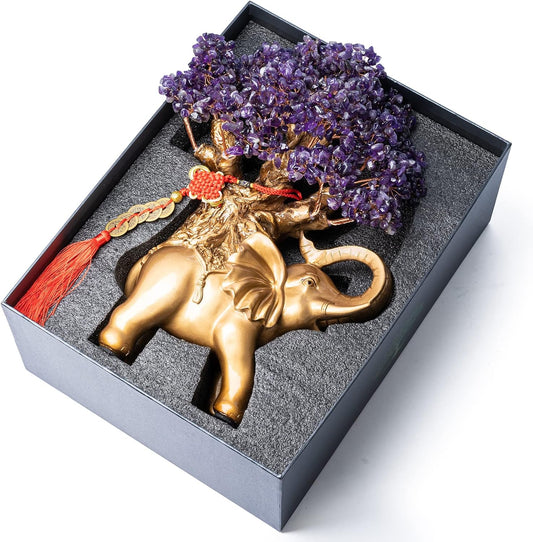 Amethyst Crystal Money Tree on Gold Elephant Statue, 17”Large Gemstone Bonsai Tree of Life Home Décor Gifts for Wealth Positive Energy, Feng Shui Décor