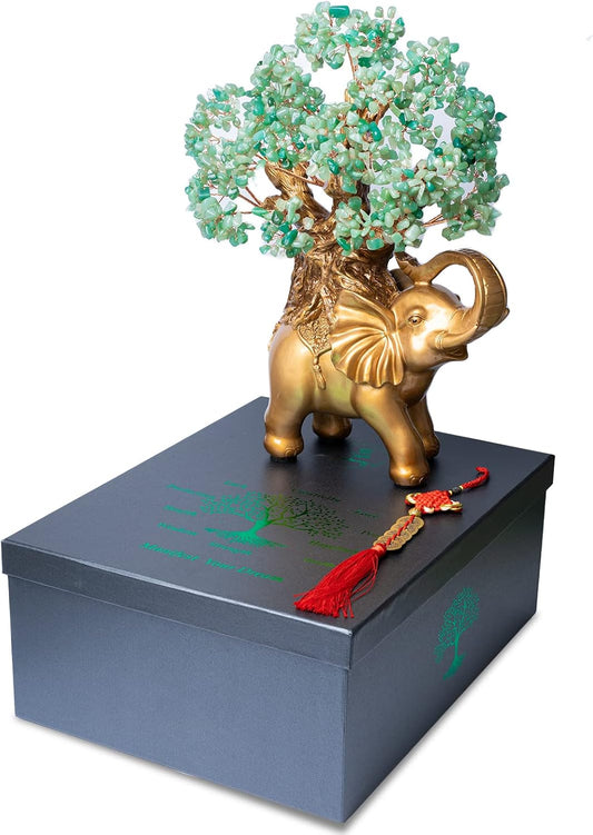 Green Aventurine Crystal Money Tree on Gold Elephant Statue, 17”Large Gemstone Bonsai Tree of Life Home Décor Gifts for Wealth Positive Energy, Feng Shui Décor