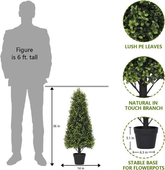 3ft Artificial Boxwood Topiary Trees (Set of 2) - UV Resistant Faux Plants Outdoor, Realistic 36" Fake Cone Bushes and Shrubs for Front Porch, Planter, Patio - Low Maintenance & Evergreen
