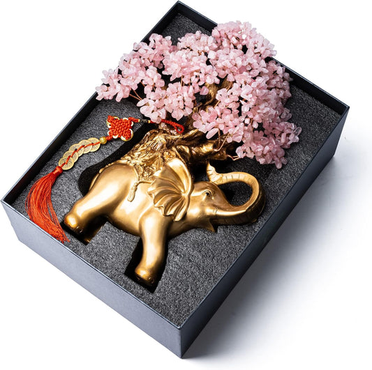 Rose Quartz Crystal Money Tree on Gold Elephant Statue, 17”Large Gemstone Bonsai Tree of Life Home Décor Gifts for Wealth Positive Energy, Feng Shui Décor