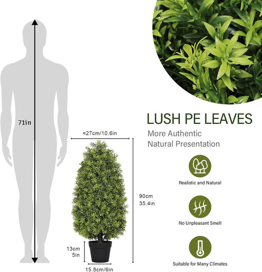 3ft Artificial Boxwood Topiary Trees (Set of 2) - UV Resistant Faux Plants for Outdoor/Indoor, Realistic 36in Fake Bushes and Shrubs for Front Porch, Planter, Patio - Low Maintenance & Evergreen