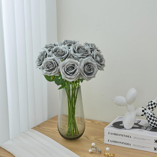 Artificial Rose 10pcs Open Flower Bouquet Faux Rose Stems for Wedding Arrangement, Bridal Bouquet, Centerpiece, Fake Faux Silk Flowers (Grey)