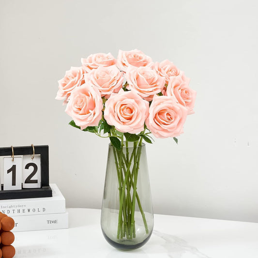 Artificial Rose 10pcs Open Flower Bouquet Faux Rose Stems for Wedding Arrangement, Bridal Bouquet, Centerpiece, Fake Faux Silk Flowers (Coral Peach)