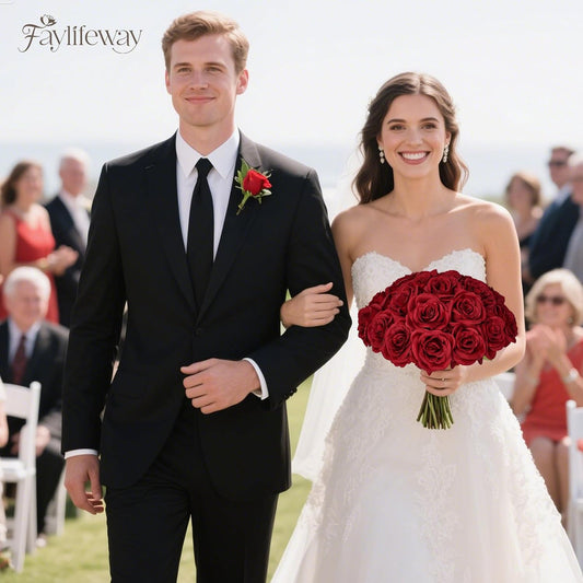 50PCS Artificial Red Roses, 3.9'' Silk Flower Head Fake Red Rose with Long Stems, Realistic Faux Roses Bouquet for DIY Wedding Home Party Office Decoration