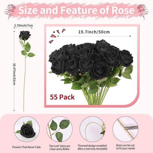 55 PCS Fake Roses Artificial Flowers Bulk, Black Roses Bridal Bouquet Silk Faux Rose with Stems for Wedding Flowers Decoration, Valentine's Day, Bridal Bouquet, Anniversary,Home Decor (55PCS, Black)