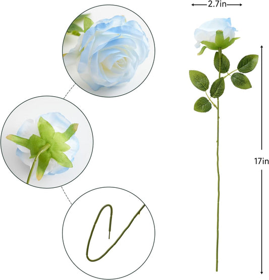 Ice Blue Artificial Roses Fake Flowers Not Bend The Peduncle with Stems for DIY Wedding Bouquets Bridal Shower Centerpieces Arrangements Tables Decorations 24pcs