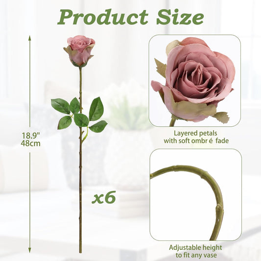 Briful Dusty Roses Pink Artificial Flowers– 6PCS 18.9" Faux Rose Silk Flowers with Long Stems Realistic Fake Rose Bouquet for DIY Wedding Arrangements Table Vase Centerpieces Home Event Decor