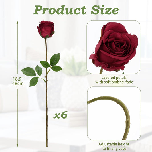 Briful Roses Artificial Flowers– 6PCS 18.9" Burgundy Rose Silk Flowers with Long Stems Realistic Fake Rose Bouquet for DIY Wedding Arrangements Table Vase Centerpieces Home Event Decor