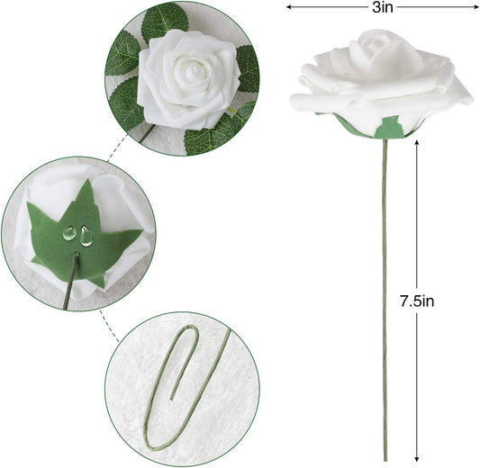 AmyHomie Artificial Flowers White Rose 100pcs Real Looking Fake Roses w/Stem for DIY Wedding Bouquets Centerpieces Arrangements Party Baby Shower Home Decorations