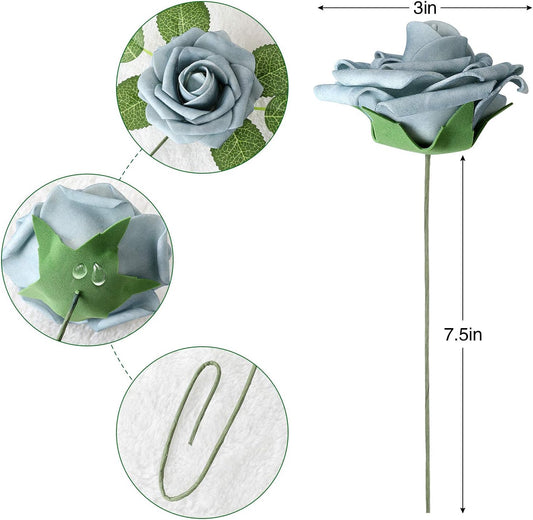 AmyHomie Artificial Flower Dusty Blue Shades Rose 25pcs Real Looking Fake Roses w/Stem for DIY Wedding Bouquets Centerpieces Arrangements Party Baby Shower Home Decorations