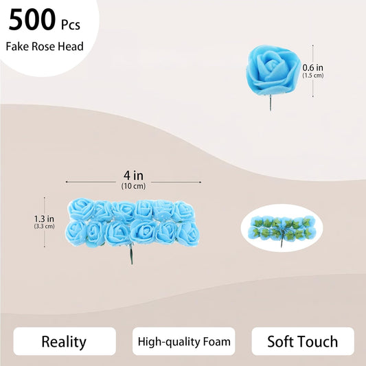 500 Pcs 0.6 Inch Mini Artificial Flowers Head Bulk 5 in 1 Set Faux Foam Fake Small Rose Tiny Baby Flores Bouquet Wreath Gift Hair Clip Home Decoration DIY Craft (Sky Blue)