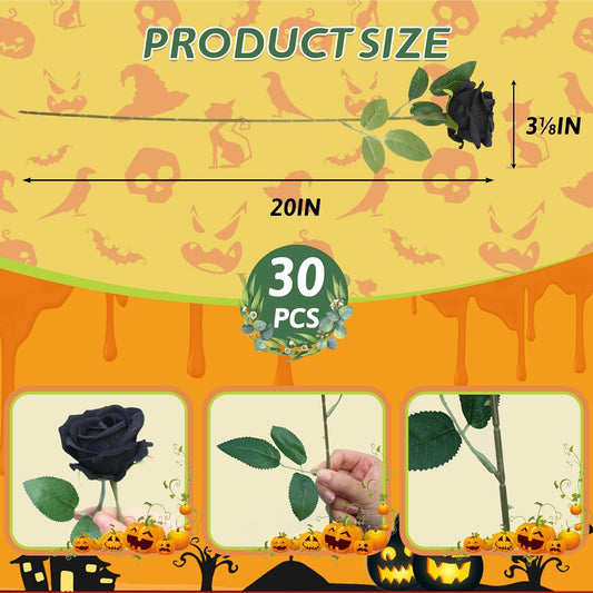 30 PCS Fake Black Roses, Artificial Flowers Bulk Halloween Decorations Realistic Silk Faux Roses with Stems for Gothic Wedding Party Decor, Bridal Bouquets DIY Floral Arrangement Home Decor