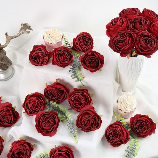 IPOPU Red Silk Roses 25pcs Flower Heads Bulk Artificial for Decoration Fake Dried Floral Bouquet for Wedding Bride Wall Flowers Decorations