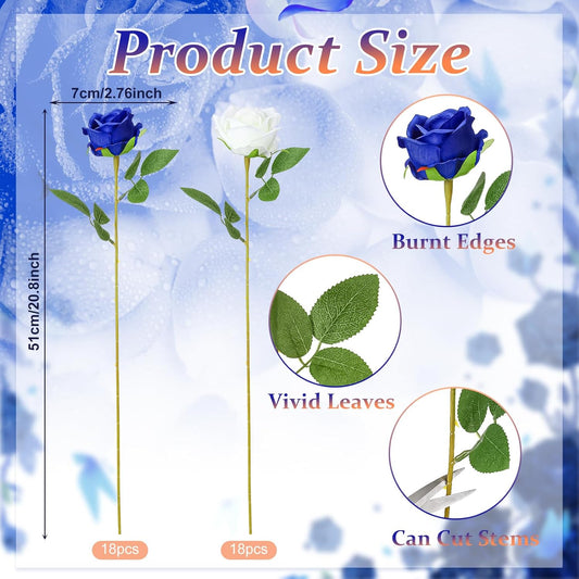 36 Pcs Silk Blue White Rose Bouquet Bridal Artificial Flowers,Fake Rose Long Stem Realistic Flowers Bulk for Wedding Bouquet Ball Arrangement Centerpiece Party Decor