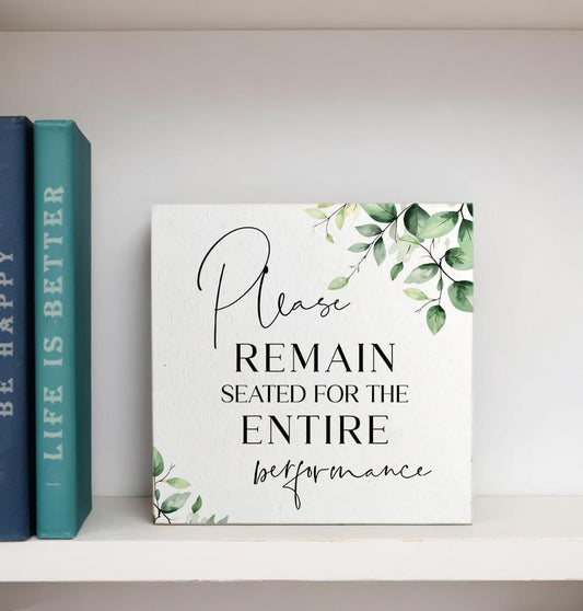 Funny Bathroom Signs, Please Remain Seated for the Entire Performance Wooden Box Sign, Eucalyptus Botanical Wood Signs Plaque for Restroom Washroom Toilet Counter Shelf Table Decor, 5x5 Inch