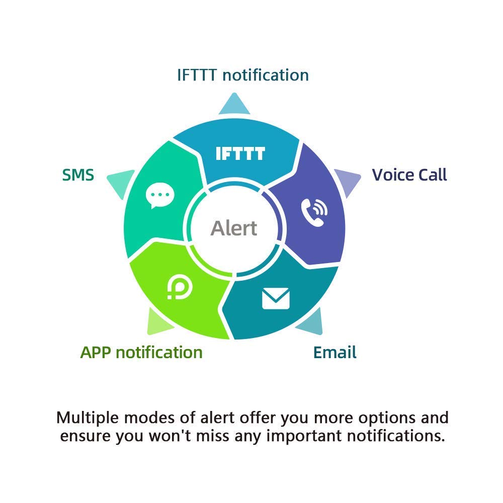 - Customized alerts can be sent to multiple users. You can be notified when device goes offline, sensor readings out of the preset range, low battery, etc. Available alerts modes include Email, APP notification, HTTP API, IFTTT, SMS, Phone Call.