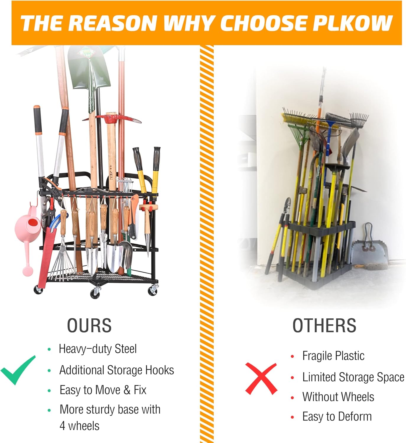 PLKOW Garden Tool Organizer with Wheels and Storage Hooks, Rolling Corner Tool Storage Rack for Garden, Shed, Garage, Powder Coated Steel, Black