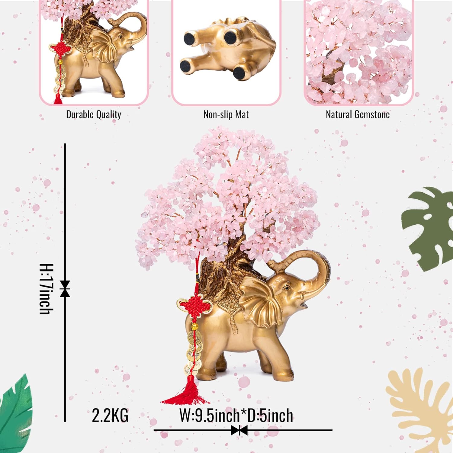 Rose Quartz Crystal Money Tree on Gold Elephant Statue, 17”Large Gemstone Bonsai Tree of Life Home Décor Gifts for Wealth Positive Energy, Feng Shui Décor