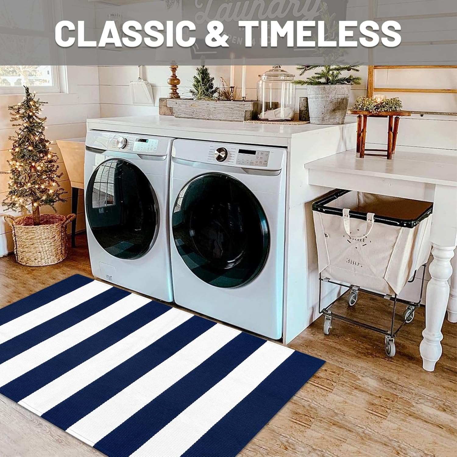 - Easy to Clean: This navy and white striped rug is simple to maintain with machine wash or vacuuming to remove dirt. The rug is sturdy and can be tumble dried on low. Keep your door rug fresh and clean with minimal effort. NOTE: Cotton rugs normally shrink slightly after washing