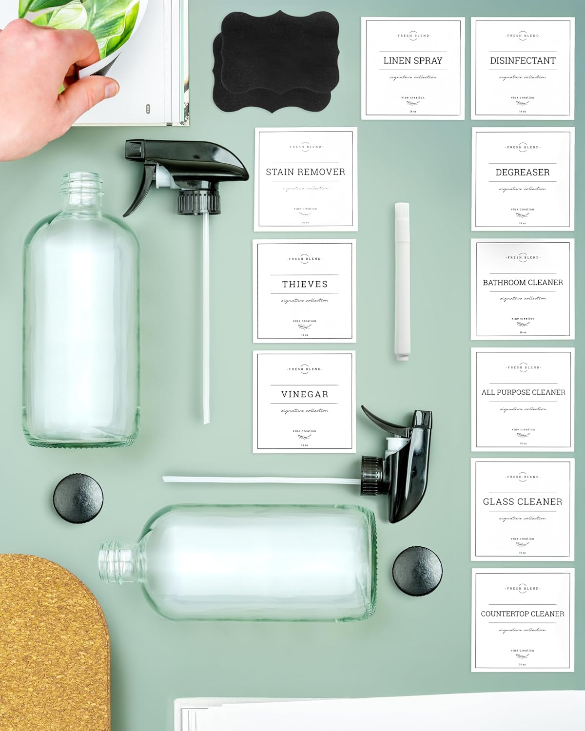 - PREMIUM WATERPROOF LABELS - Ten elegant high-end labels included, glass cleaner, countertop cleaner, vinegar, all purpose cleaner, thieves, bathroom cleaner, degreaser, disinfectant, linen spray, and stain remover. Durable and waterproof for daily use. Additionally two chalk labels for any other needs, white marker is included. Premium Labels measurement 3" x 3".