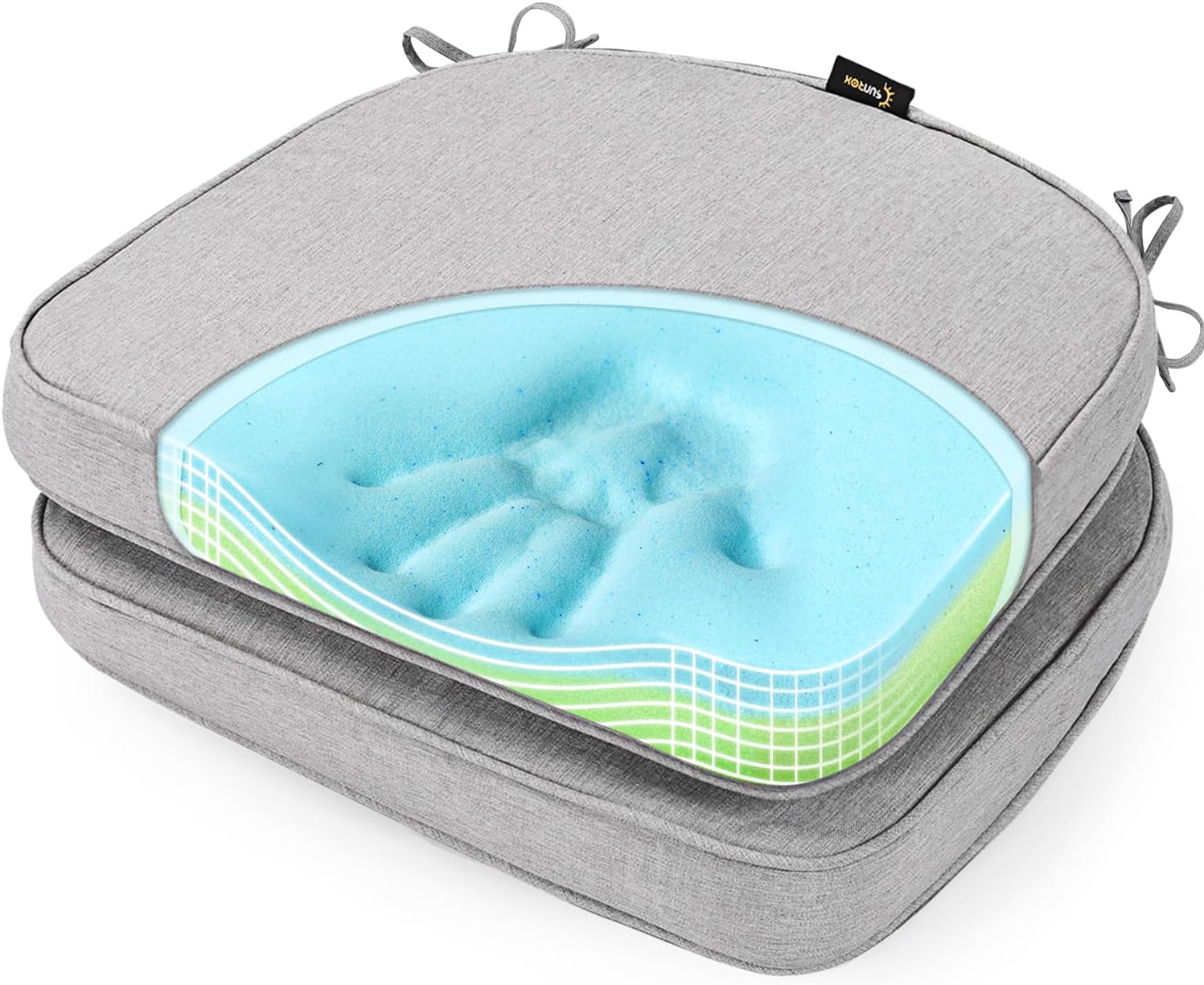 SUNROX Gel Memory Foam Chair Cushions, FadeShield Water-, Stain-Resistant Durable Reversible Seat Cushion Pads with Ties for Indoor/Outdoor Kitchen Dining Office, 19"x19", Set of 2, Heather Grey