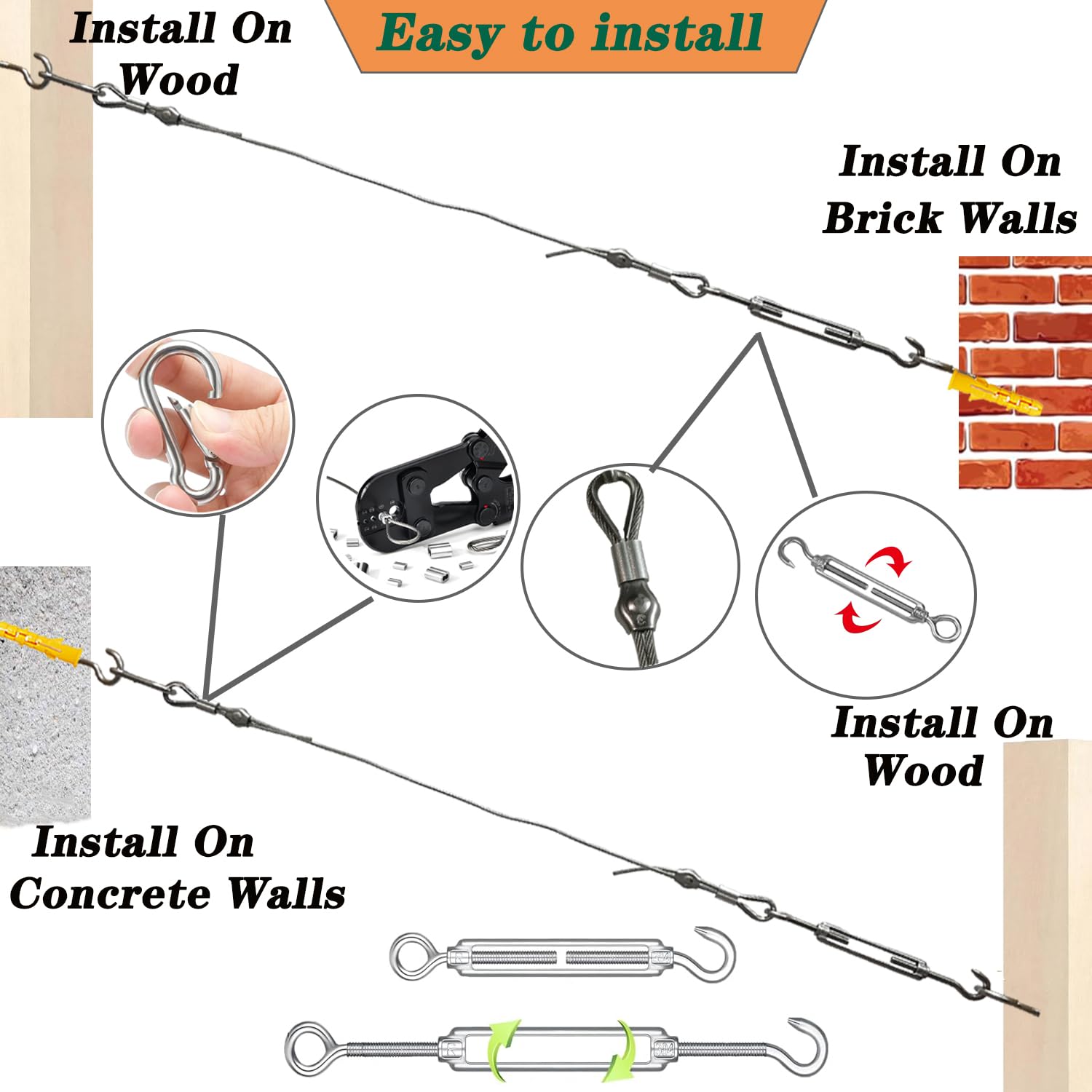 - 【Easy Installation】: This stainless steel cable is very easy to install. It only requires aluminum crimping sleeve tools and cable cutters to complete the deck cable railing. The squeeze turnbuckle tensioner can be adjusted to tighten the wire rope.it a simple task to put up the strings light no matter on wood, timber or concrete wall (Removable and reusable)