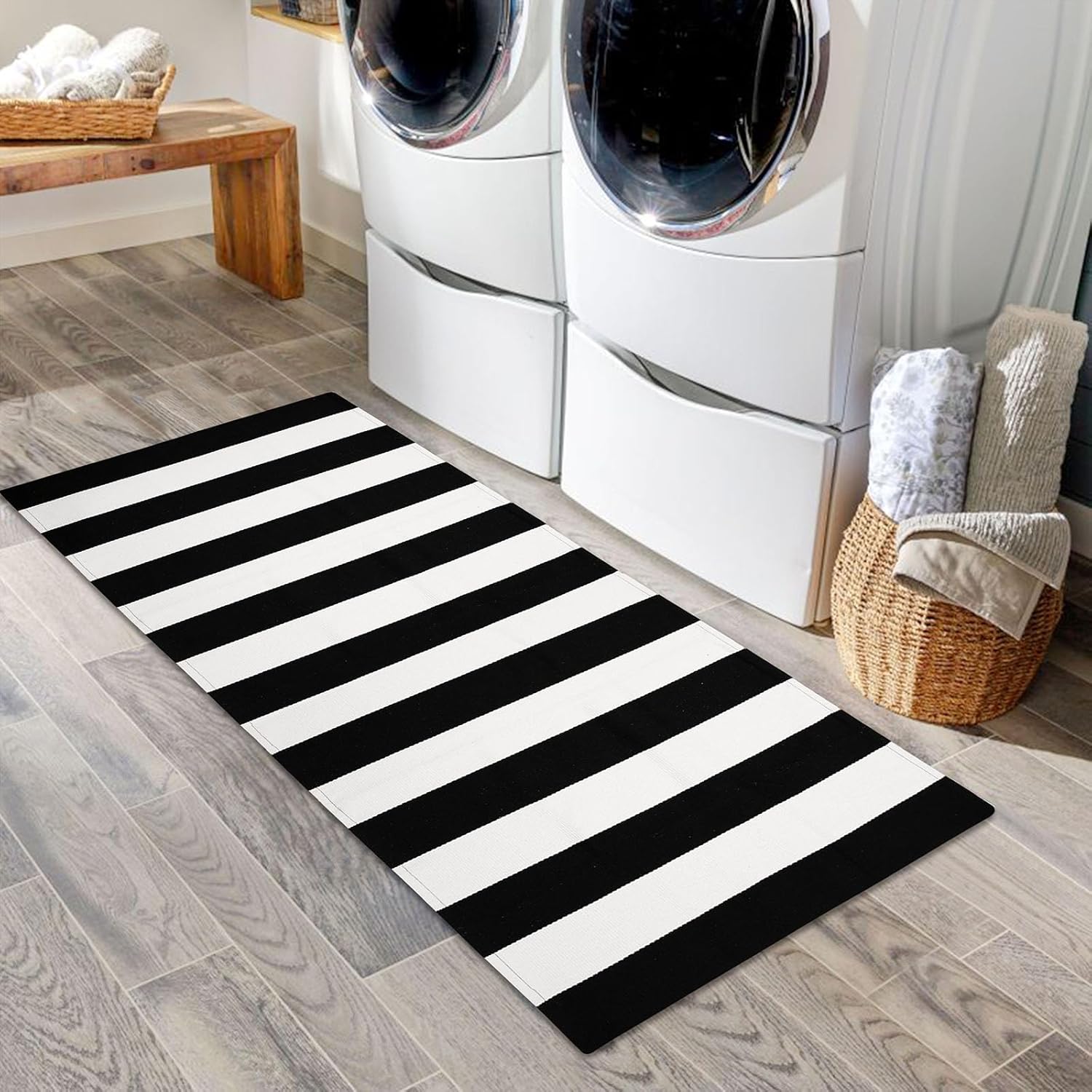 - Easy to Clean: This black and white striped rug is simple to maintain with machine wash or vacuuming to remove dirt. The rug is sturdy and can be tumble dried on low. Keep your door rug fresh and clean with minimal effort. NOTE: Cotton rugs normally shrink slightly after washing