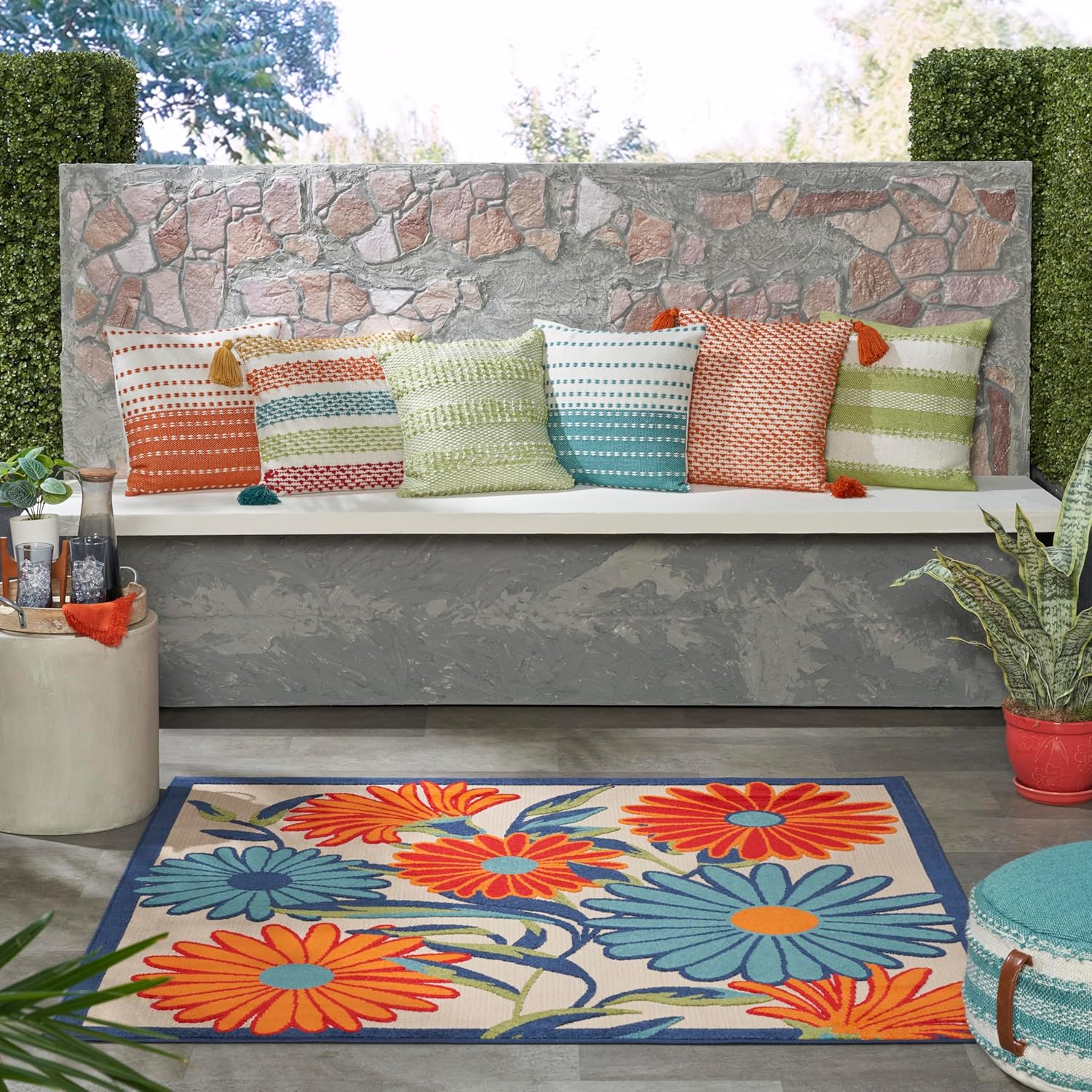 - Floral outdoor rug adds a subtle sense of depth to your space
