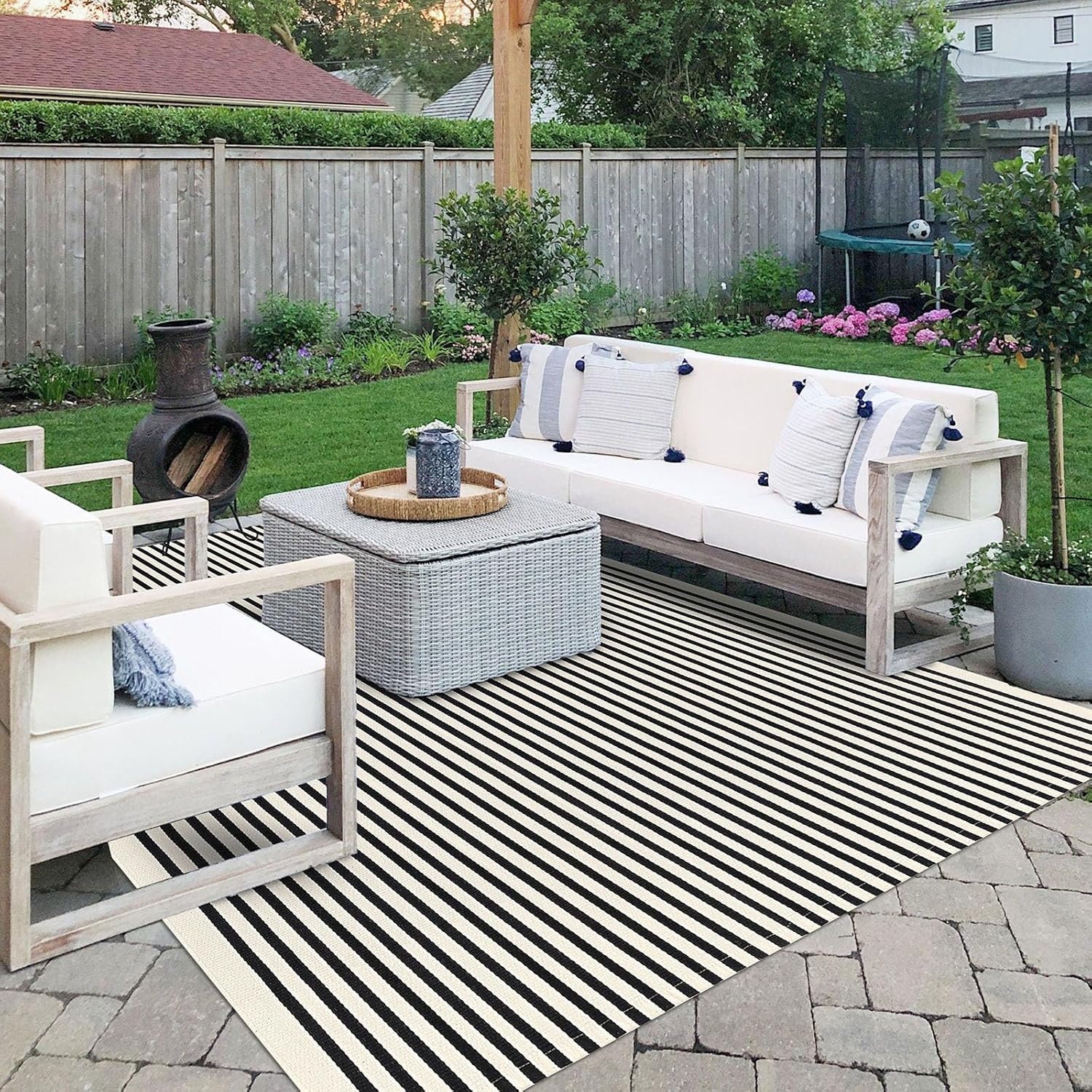 IOHOUZE Black Beige Striped Rug -8'x10' Indoor Outdoor Rug, Washable Area Rug for Living Room, Large Patio Rug, Cotton Striped Rugs for Patio Living Room Bedroom