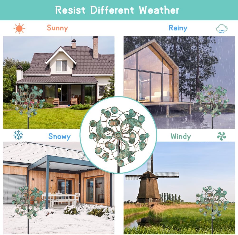 - 【Design】: This garden wind Spinner features two intricately designed spinning blades, adorned with vibrant turquoise-hued accents that catch the light beautifully. As the wind gently caresses its elegant form, the wind spinner gracefully rotates, creating a soothing and visually stunning display.