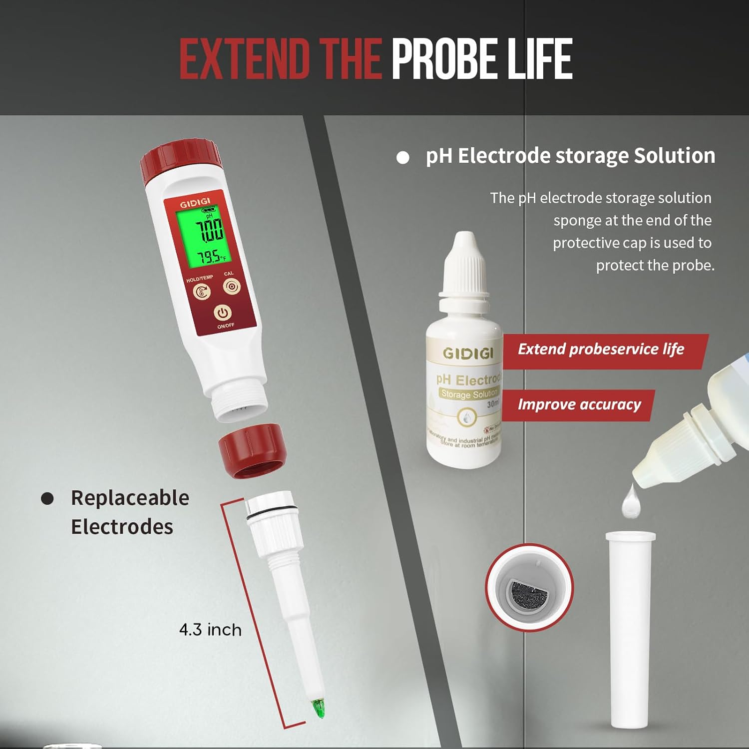- [Multi-purpose Best Food pH Tester] GIDIGI pH tester measurement range: 0-14 pH. Durable waterproof and dishwasher safe protective case, detachable probe to longer service life and cost-effective. GIDIGI pH meter can measure meat (5.5-6.2), fermented sausage (4.5-5.5), sushi (4.1-4.6) and seafood (average 6.2) ,oral saliva (6.2 - 7.6) etc. If you want to measure alkaline foods, you can also search for pH 10.01 calibration solution in the store for calibration measurement.