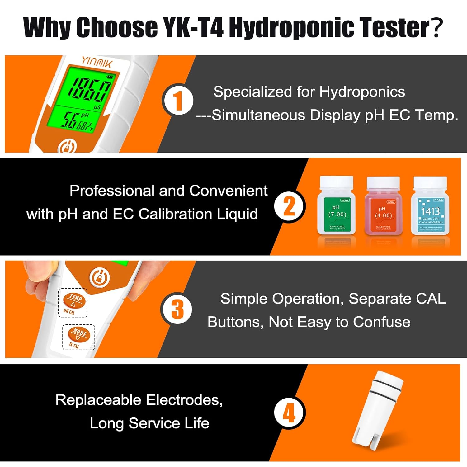 - {One-click access to the temperature pH EC value of hydroponic nutrients solution} YINMIK 4-in-1 pH EC tester is a professional tester for hydroponic growers. The pH ppm mode is designed for hydroponic basic reservoirs, and the pH EC mode is designed for hydroponic nutrient solutions.The pH and temperature of this product are always displayed on the screen.