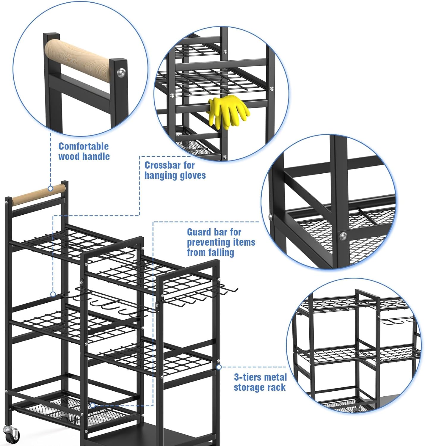 - With Extra Storage Guard Bar: Considering that the items on the shelf may fall off as the storage rack cart moves, we have added a square guardrail at the bottom of the shelf to secure items in place, so that even if the shelf moves, the items will not fall off.