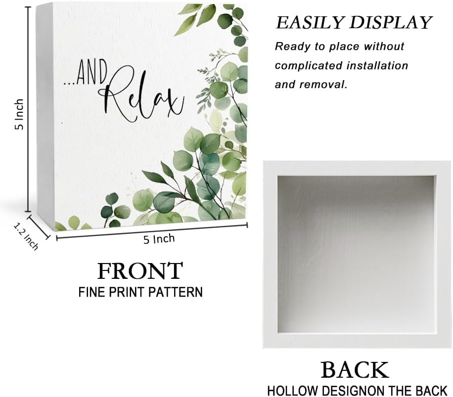 Relax Sign, Funny Bathroom Wooden Box Sign, Eucalyptus Botanical Wood Signs Plaque for Restroom Washroom Toilet Counter Shelf Table Decor, 5x5 Inch