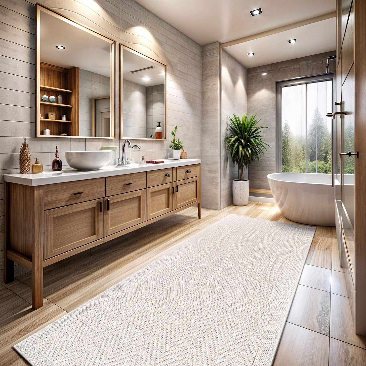 CAMILSON Indoor and Outdoor Runner Rug Off-White Herringbone Seagrass Boho Design Easy-Cleaning Non Shedding Fiber Living Room Bedroom Garden Patio and Kitchen Washable Outside Carpet Alfombras (2x7)
