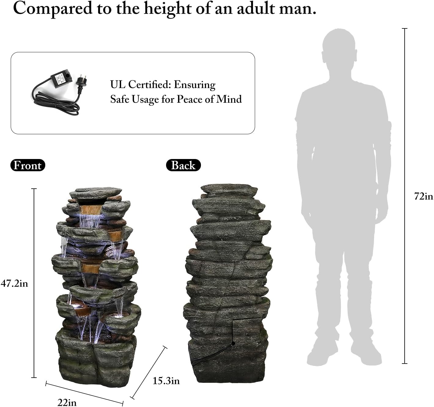 SunJet 47.2" High 6-Tiers Cascading Rock Outdoor Water Fountain with LED Lights - Large Outdoor Fountains and Waterfalls for Garden or Patio, Yard, and Deck Decor, Featuring Natural Stone Look