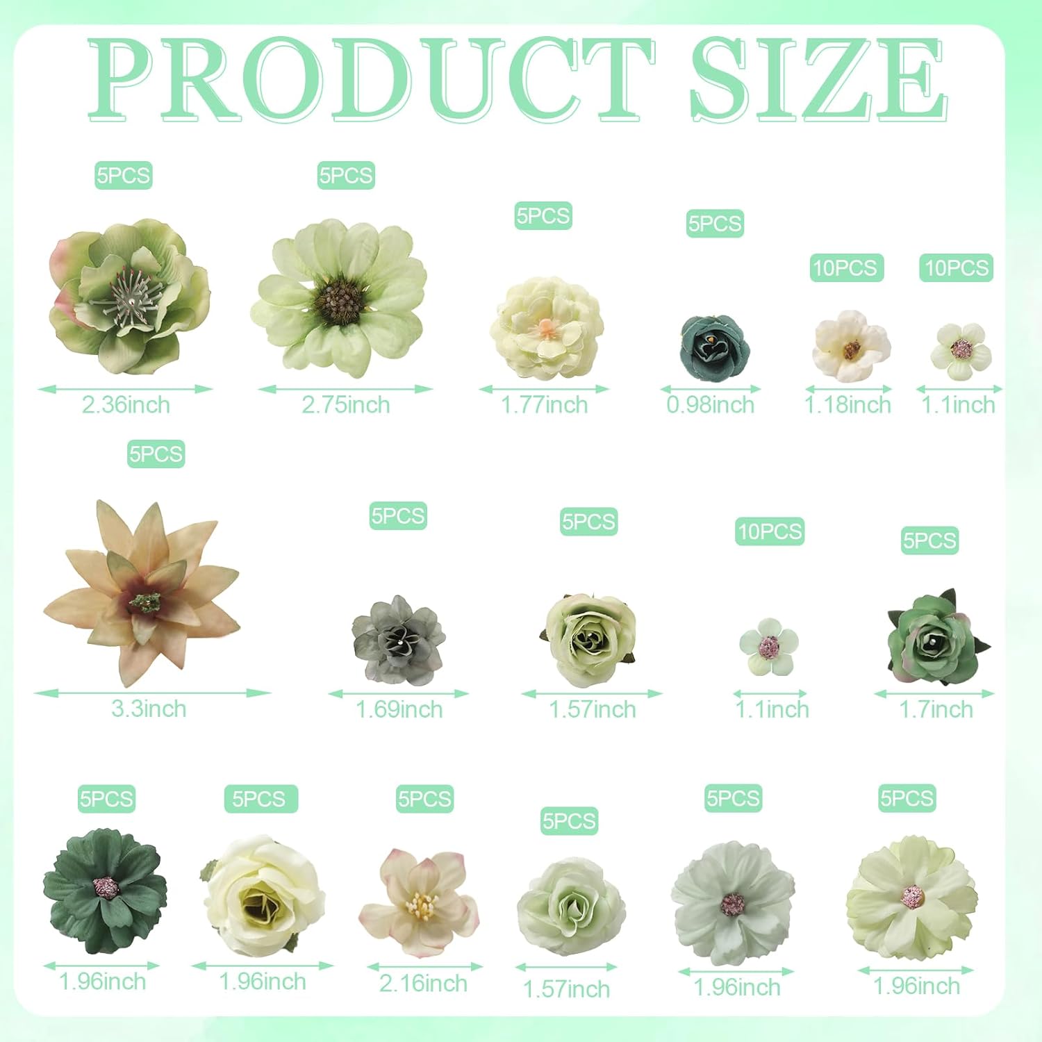 - Package Details:0.9inch mini daisy flowers x20pcs;1.1inch White wild rose x10pcs;1.7inch Star-Talk Flower x15pcs;1.37inch Light green orchid x5pcs;2.75inch clematis flower x5pcs;1.96inch camellia flower x5pcs;1.96inch daisy x5pcs;0.9inch mini rose x5pcs;1.57inch Scottish Green Rose x10pcs;1.18inch Green rose x5pcs;1.57inch high-centered rose x5pcs,1.77inch gardenia rose x5pcs;1.57inch peonies x5pcs,