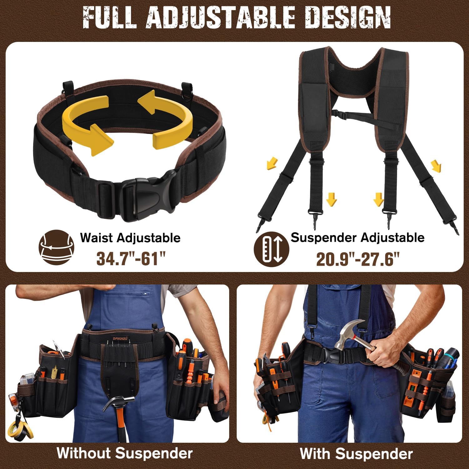 - Made for Professionals: Ideal for carpenters, electricians, roofers, and construction workers,etc. This tool belt with suspenders lets you carry heavy loads comfortably, access tools faster and keep your workspace organized for maximum productivity