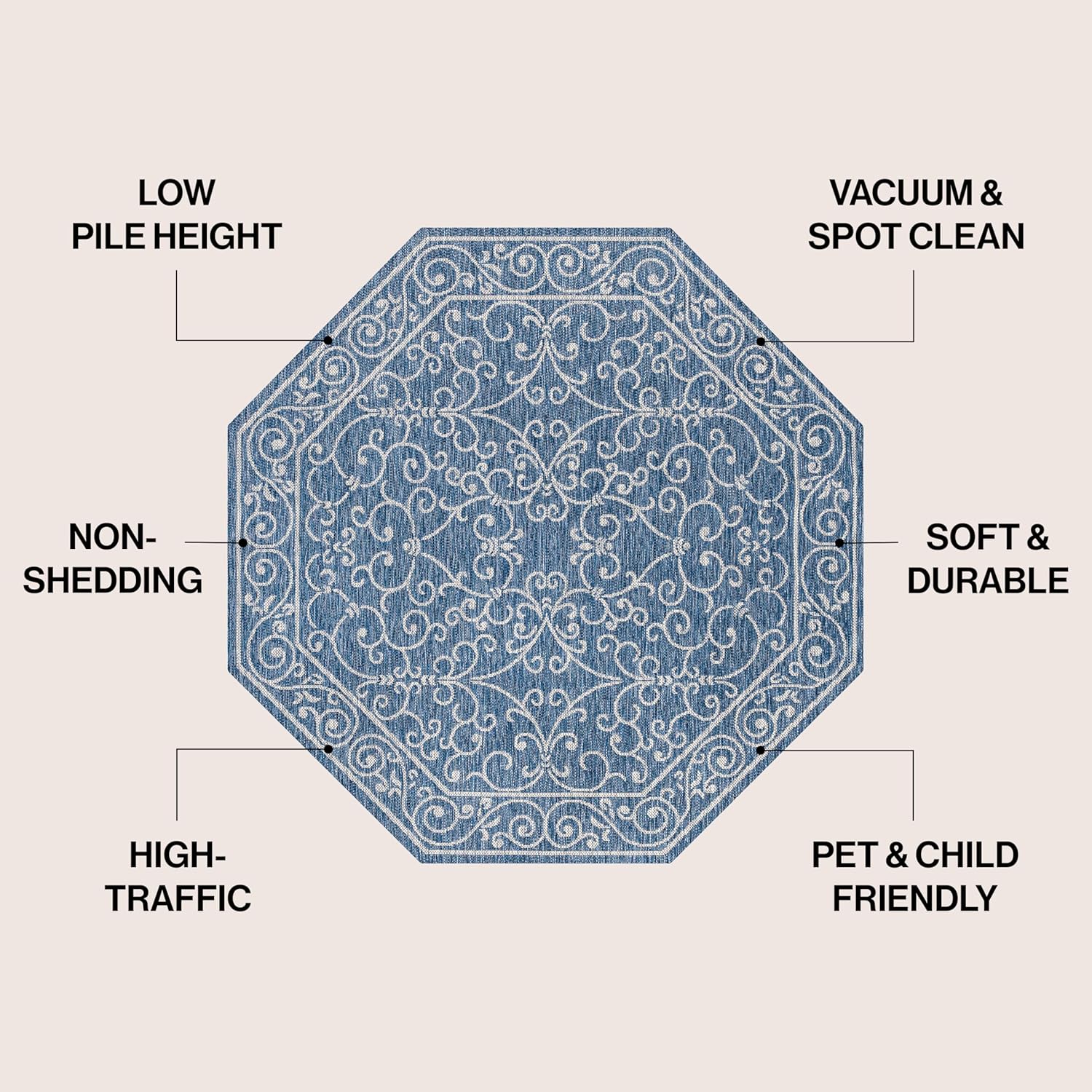 JONATHAN Y SMB106D-8TGN Charleston Vintage Filigree Textured Weave Navy/Gray 8' Octagon Indoor/Outdoor Area Rug, Non-Shedding, Stain Resistant,Fade Resistant, Easy-Cleaning for Backyard Patio, Porch