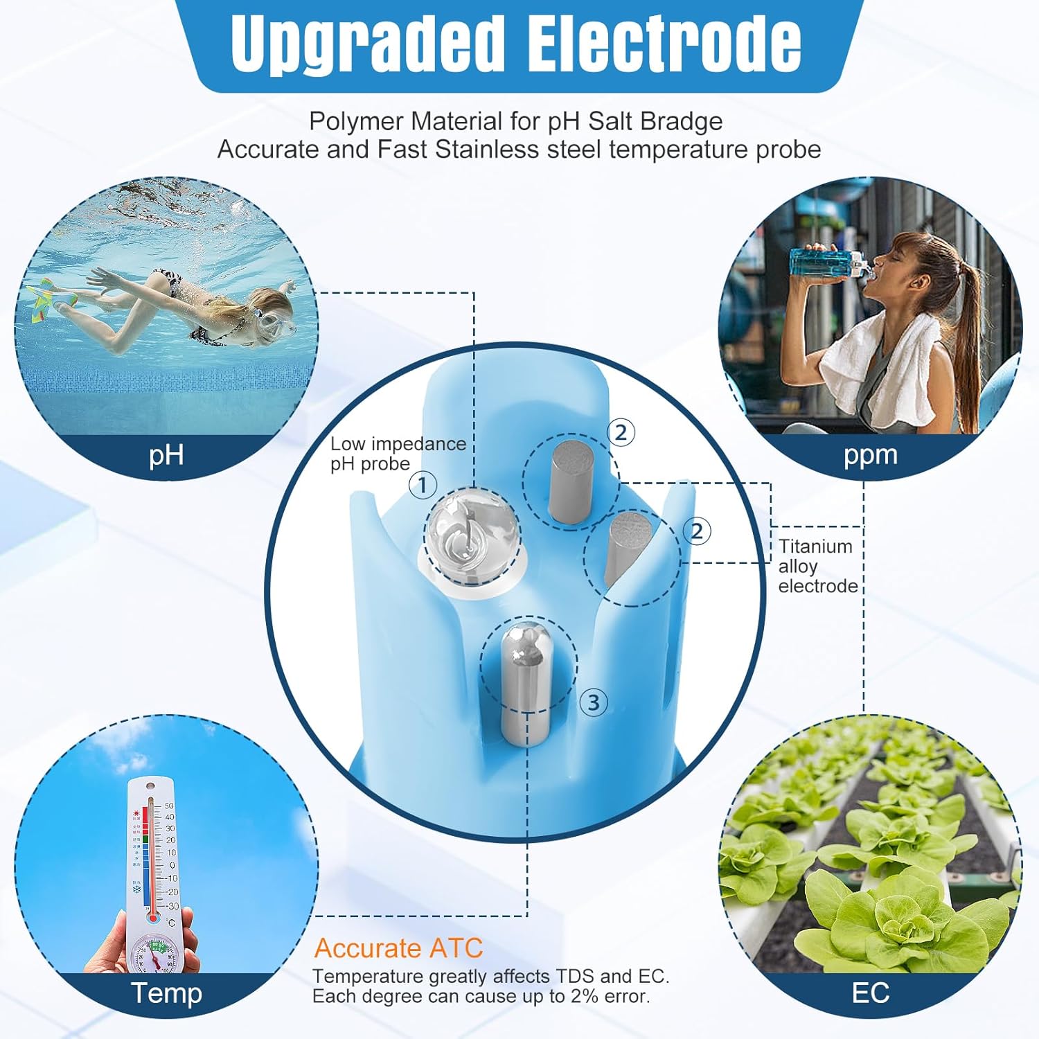 - {Wide range of applications} Perfectly used for checking pH value of Hydroponics Nutrient Solution, Home Drinking Water, Swimming Pool/ Hot Tub Water, Aquarium/ Fish Tank Water. Monitoring pH on Home Wine/ Beer/ Juice brewing, Aeroponics, Ro System, Aquaculture. Any liquid that needs to measure pH EC TDS can be used.