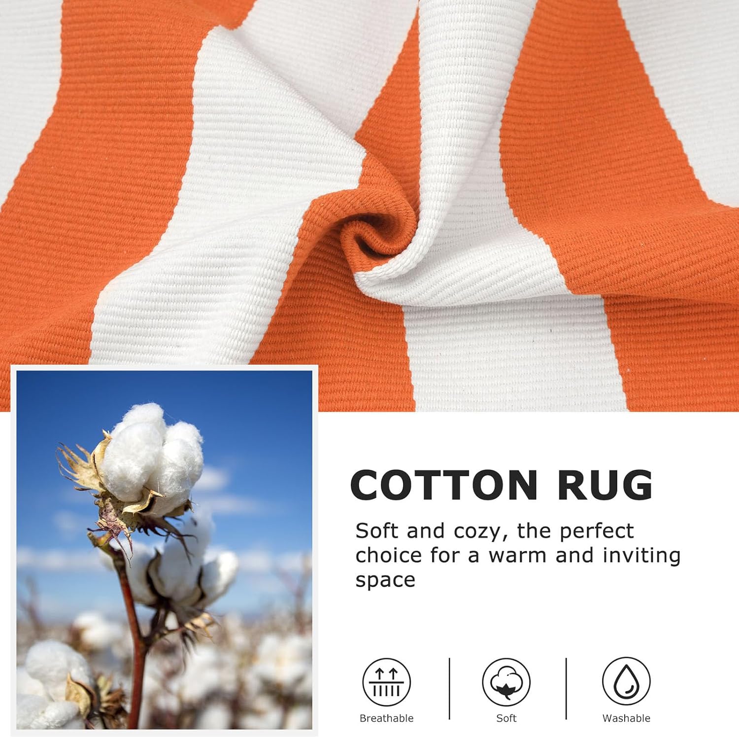 - Easy to Clean: This orange and white striped rug is simple to maintain with machine wash or vacuuming to remove dirt. The rug is sturdy and can be tumble dried on low. Keep your door rug fresh and clean with minimal effort. NOTE: Cotton rugs normally shrink slightly after washing