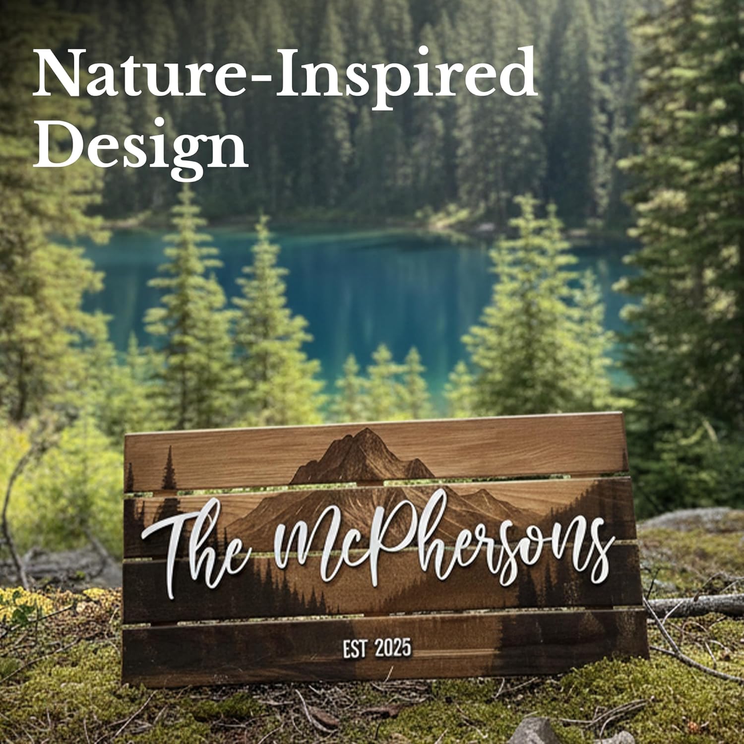 - Nature-Inspired Design: Features a unique, high-quality engraving of a mountain, forest, and lake landscape, adding a breathtaking and modern touch to the classic family name sign.